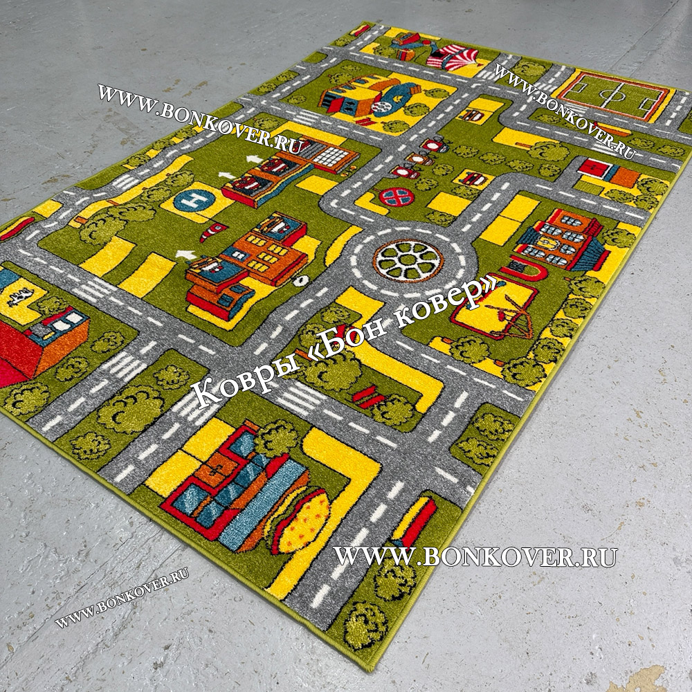 Детский Ковер Город 02 Зеленый не деформируется, сохраняет свою форму. Ворс легко восстанавливается, что не оставляет на поверхности изделия неприглядных отметин.